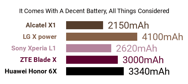 . Sure, 32GB may sound decent by middle-class standards, but knowing that several rivals with comparable pros and cons are offered in 64GB variants, it winds up as a slight drawback in our book. That being said, it does support a passable 128GB's worth of external memory. Another potential turn-off is the 2.5-hour (150 minutes) charging time of its 3340mAh cell, which is significantly longer than even those of some full-blown big battery smartphones. Its battery pack does have its merits, though, such as the reassuring 2.15-day standard usage time
